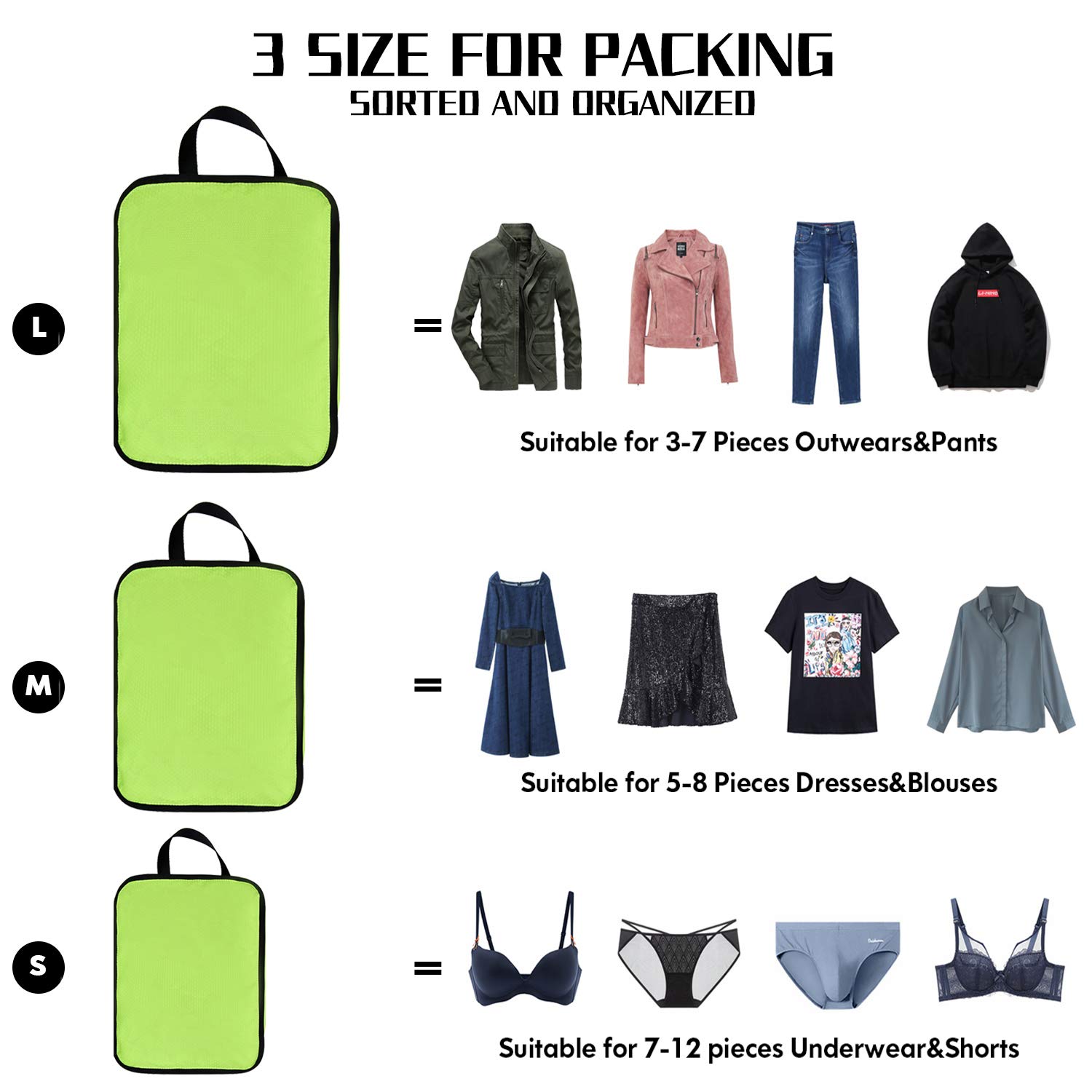 Casa / Productos / Bolsa de viaje / Cubos de embalaje de viaje / Juego de cubos de embalaje de compresión de viaje, varios tamaños, organizadores de equipaje de viaje, accesorios
